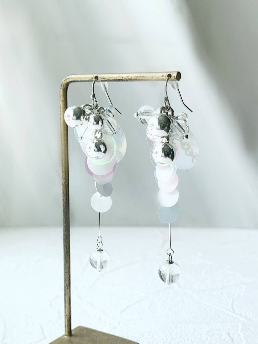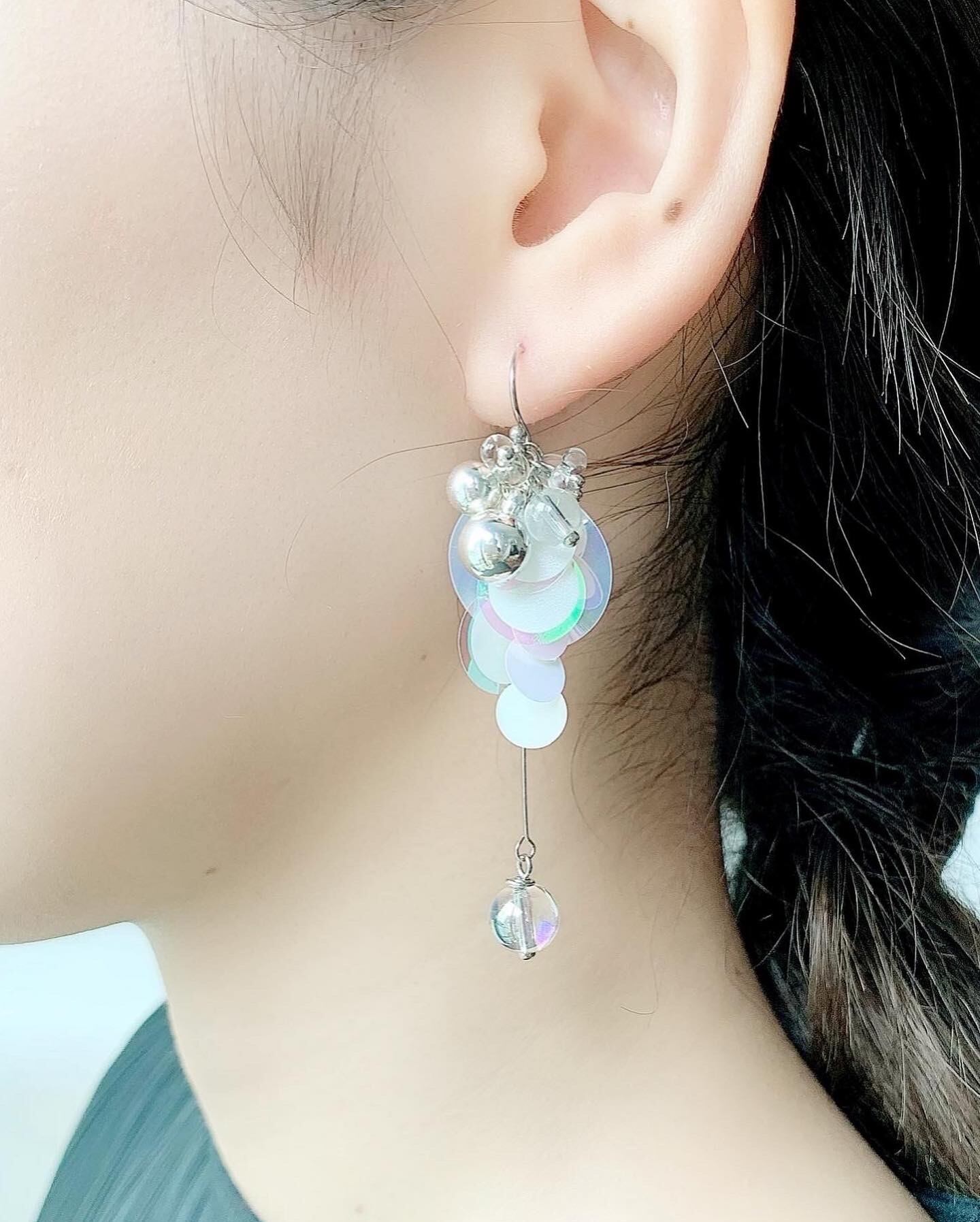 スパンコールとクリアガラスのビーズ、小さな丸いボールパーツが可愛いい、揺れるタイプの耳飾りです。