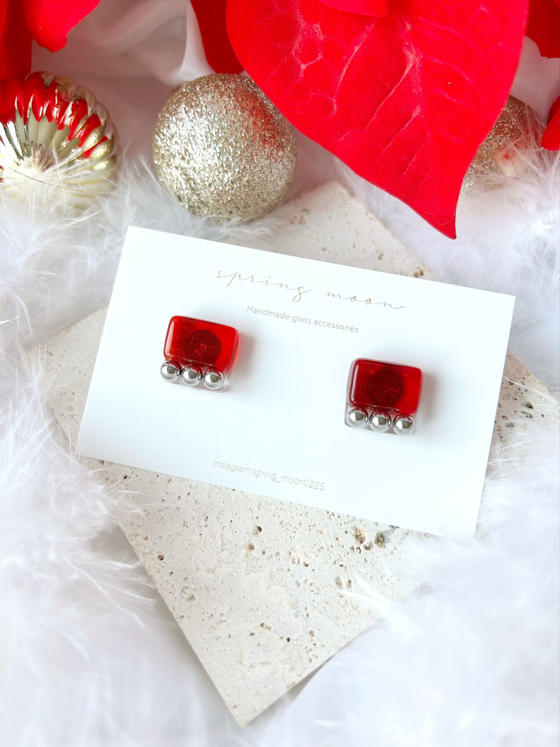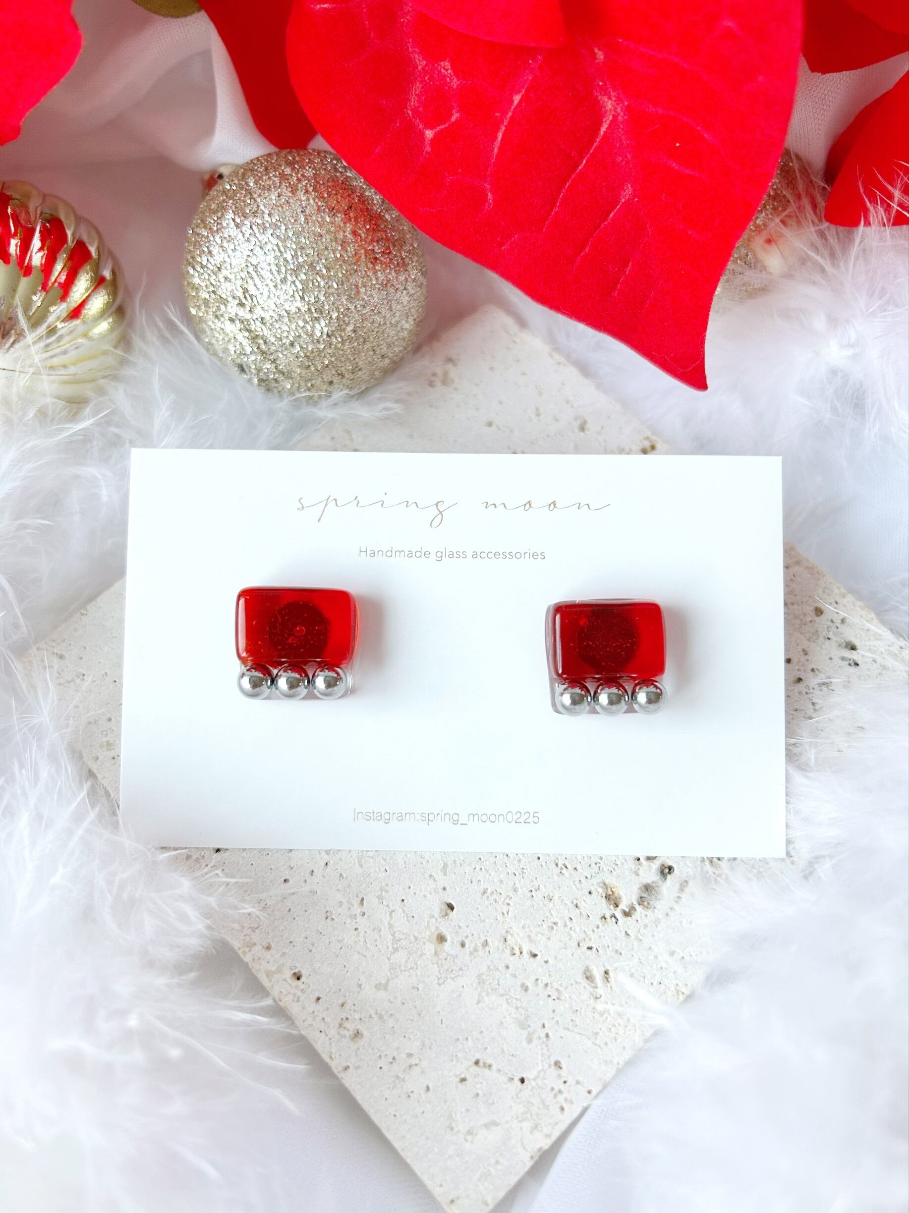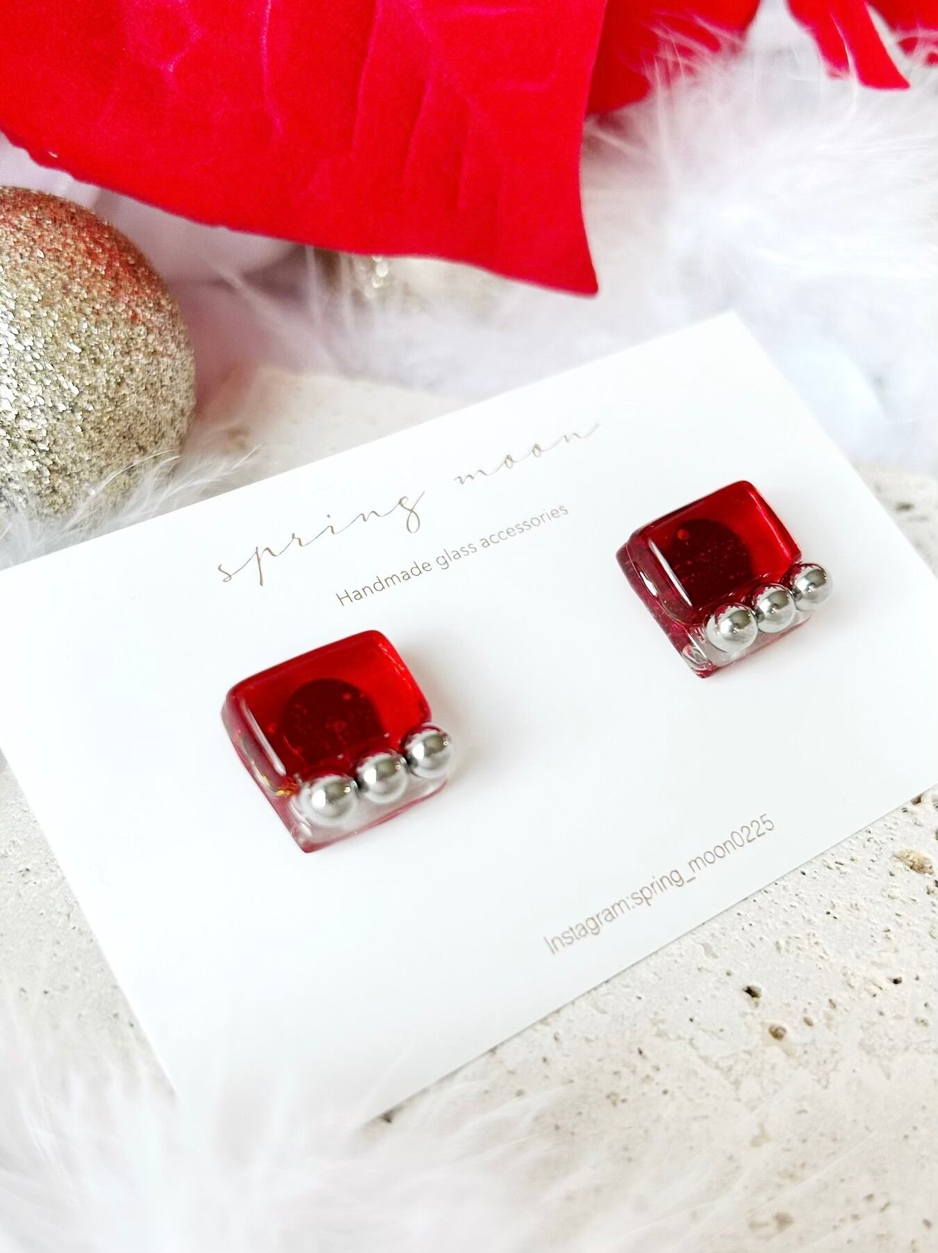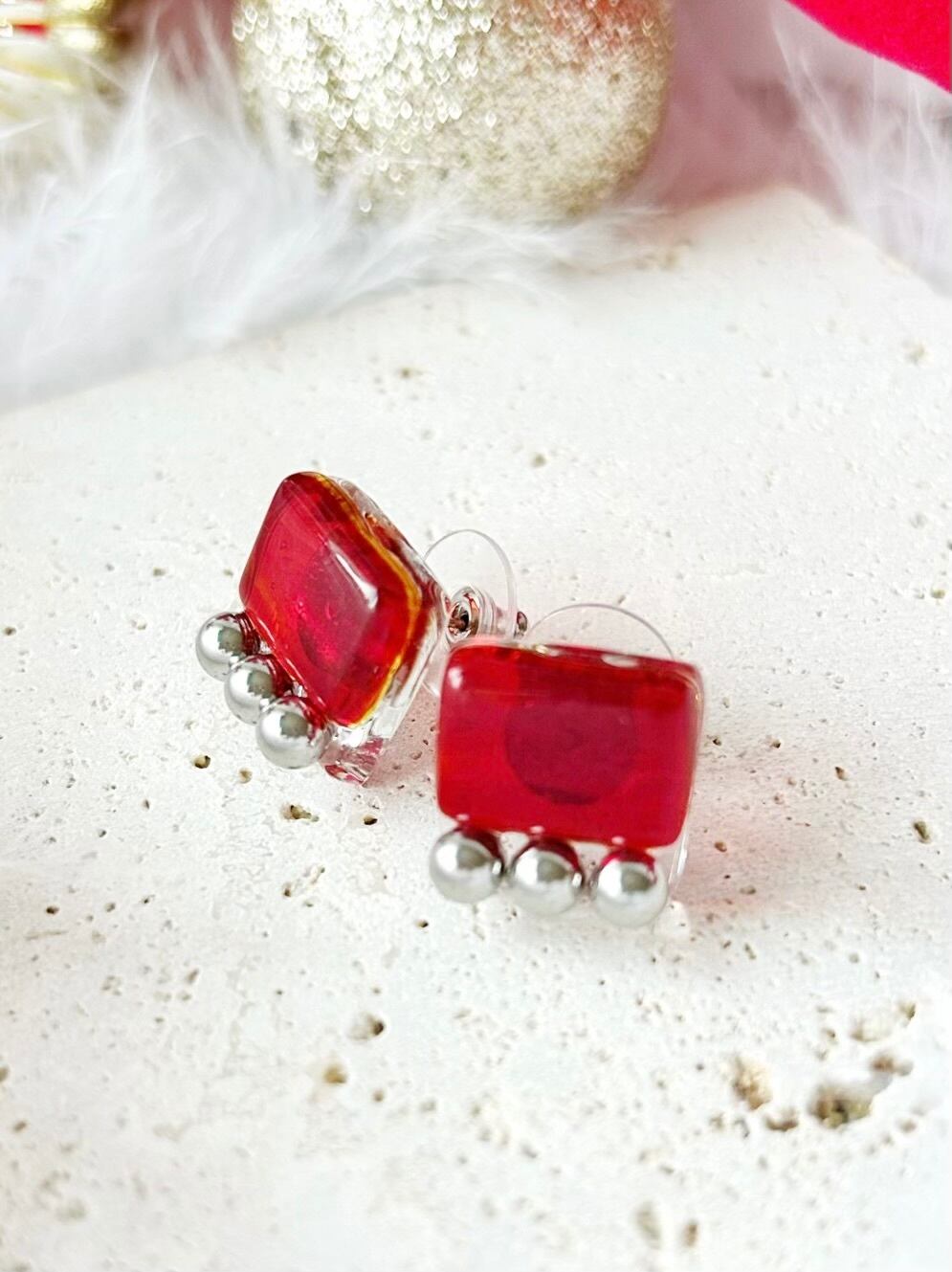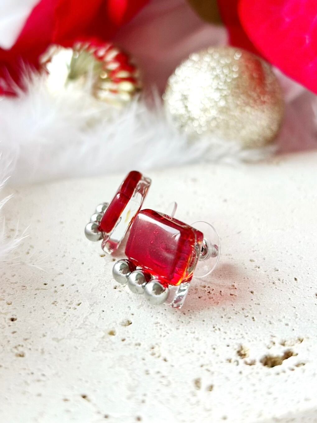 square glass metal earrings〜rectangle red〜