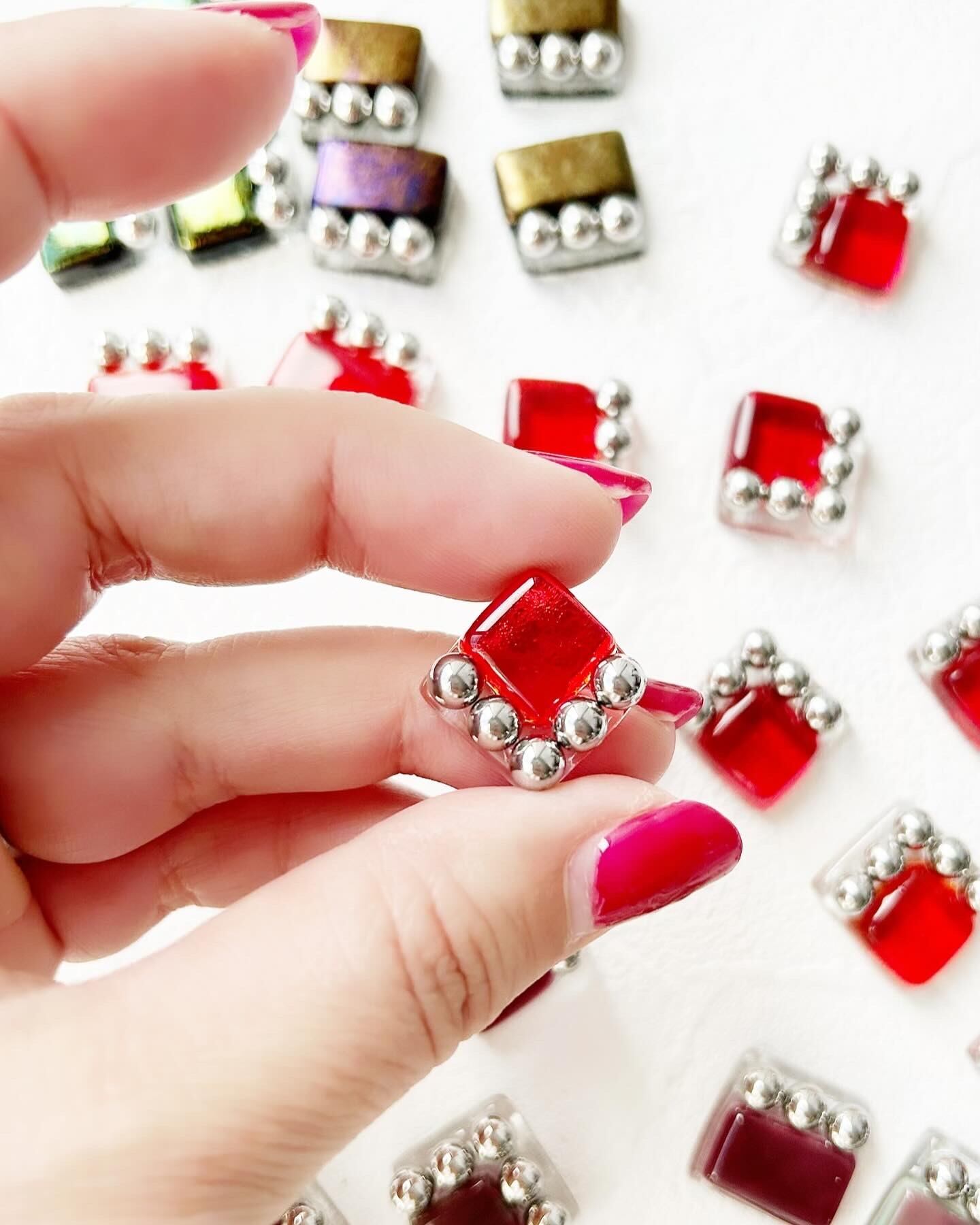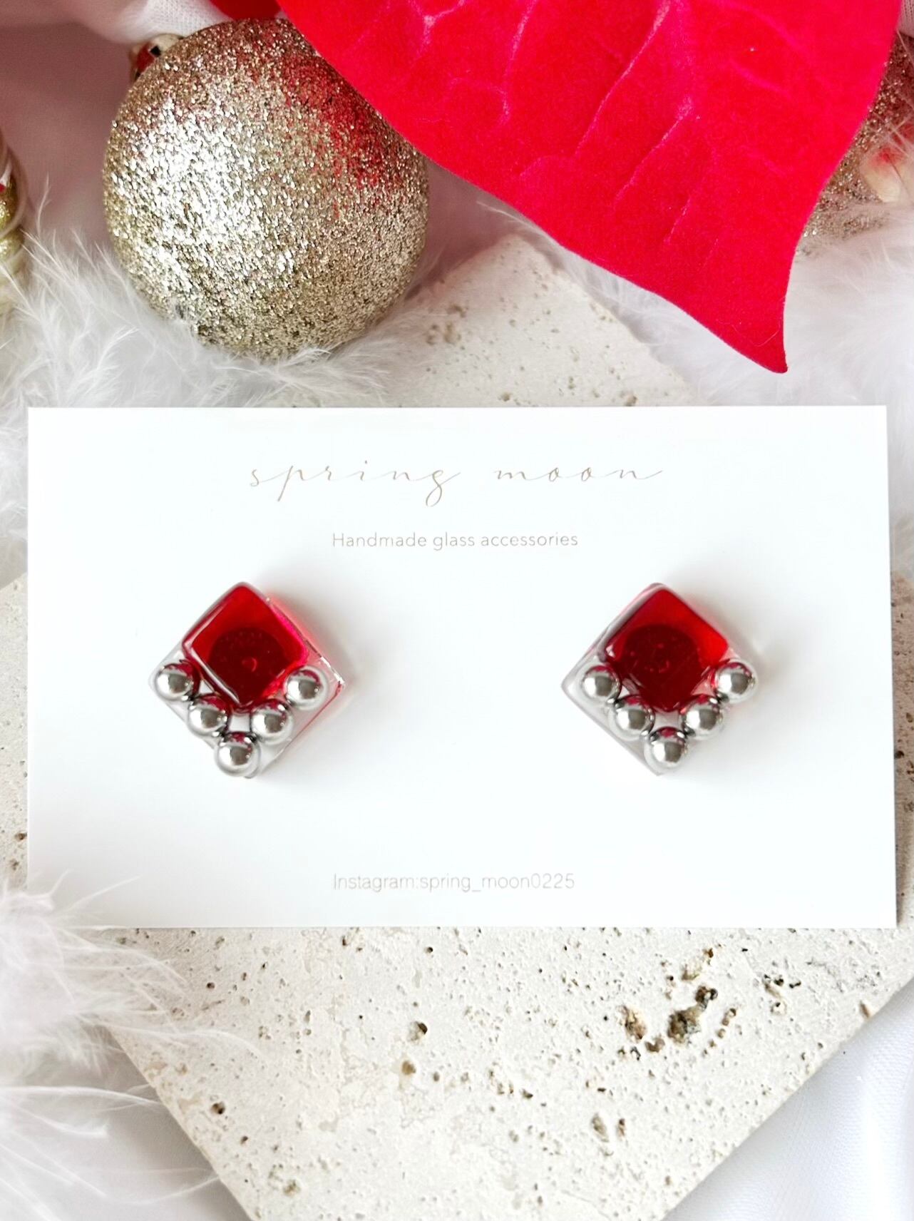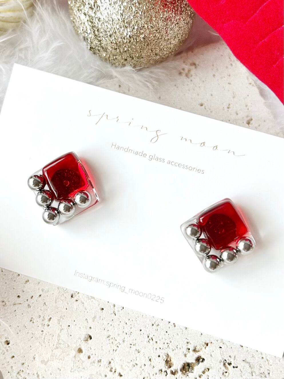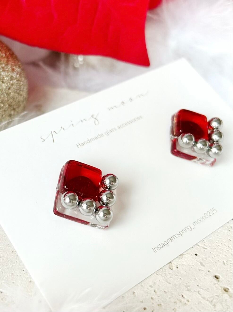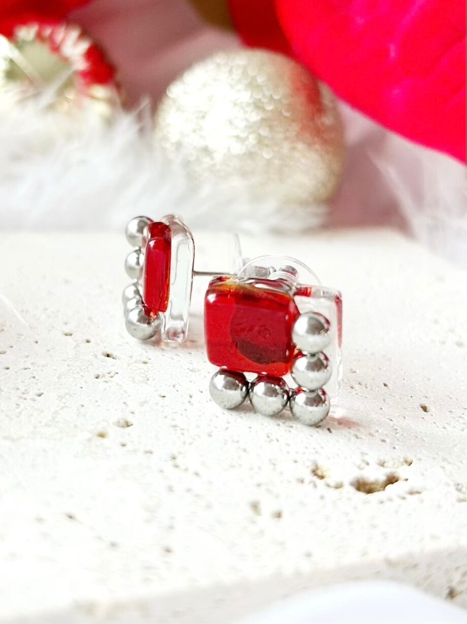 square glass metal earrings〜red arrow〜