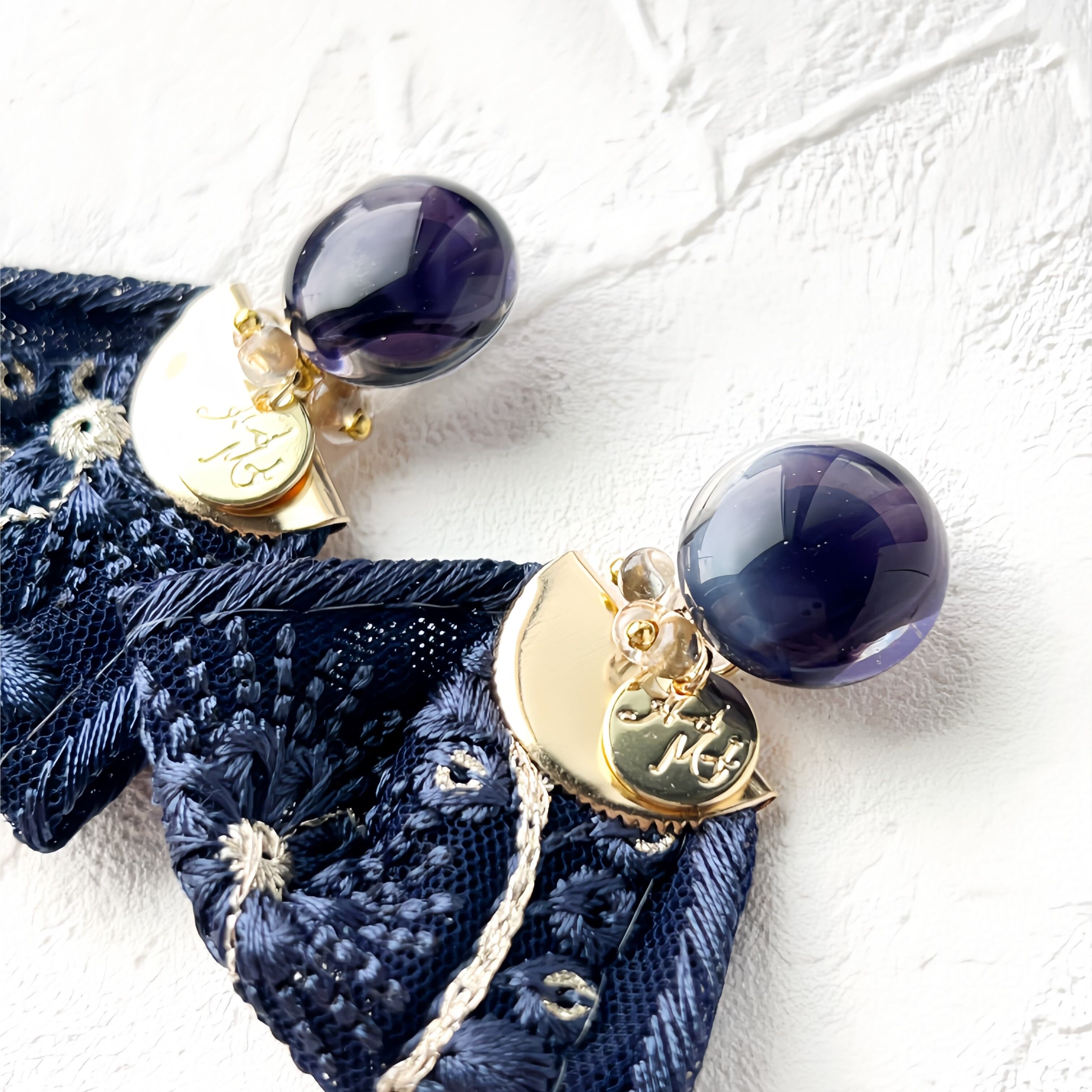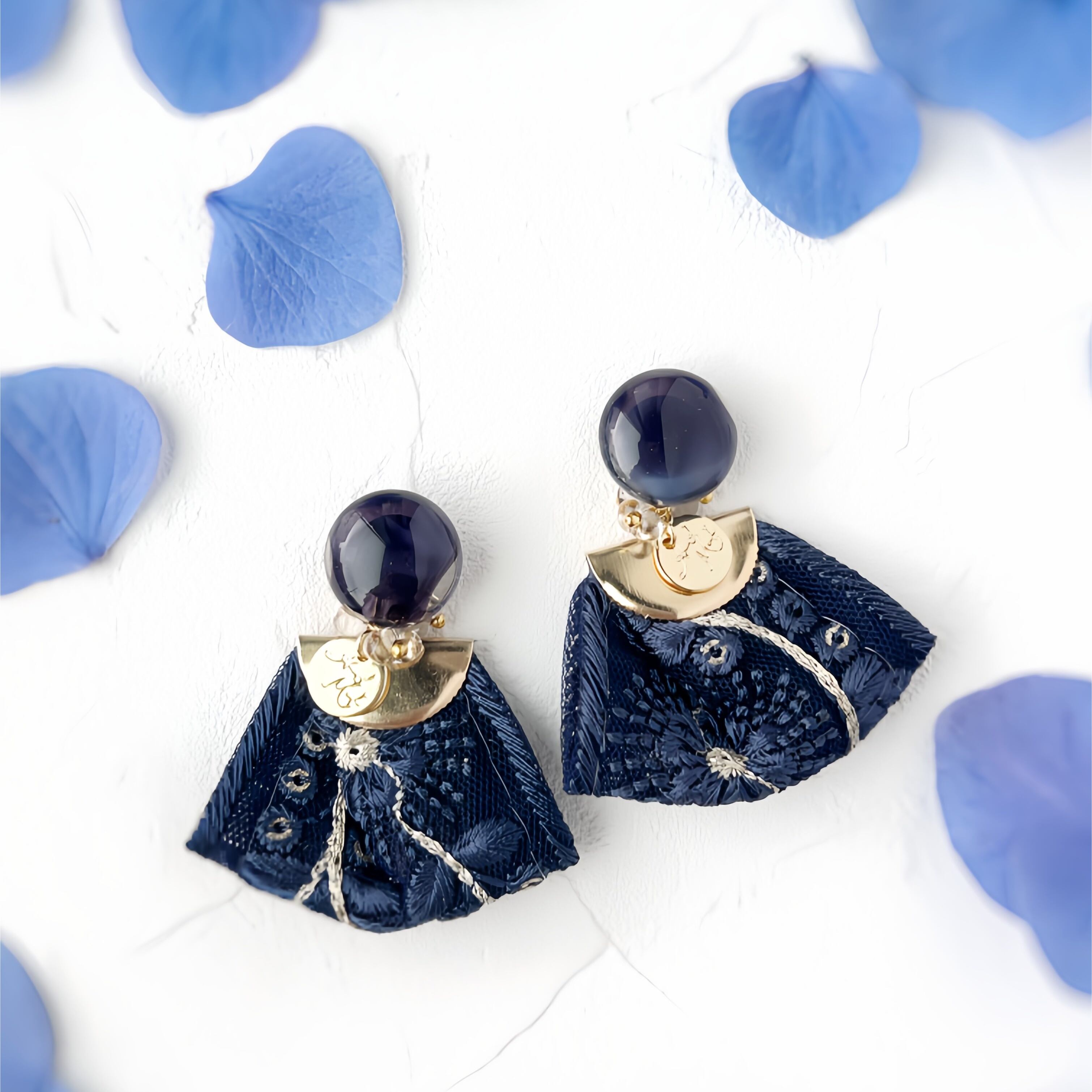 2wayインド刺繍タッセルのガラス耳飾り-紫陽花シリーズ-"navy blue"