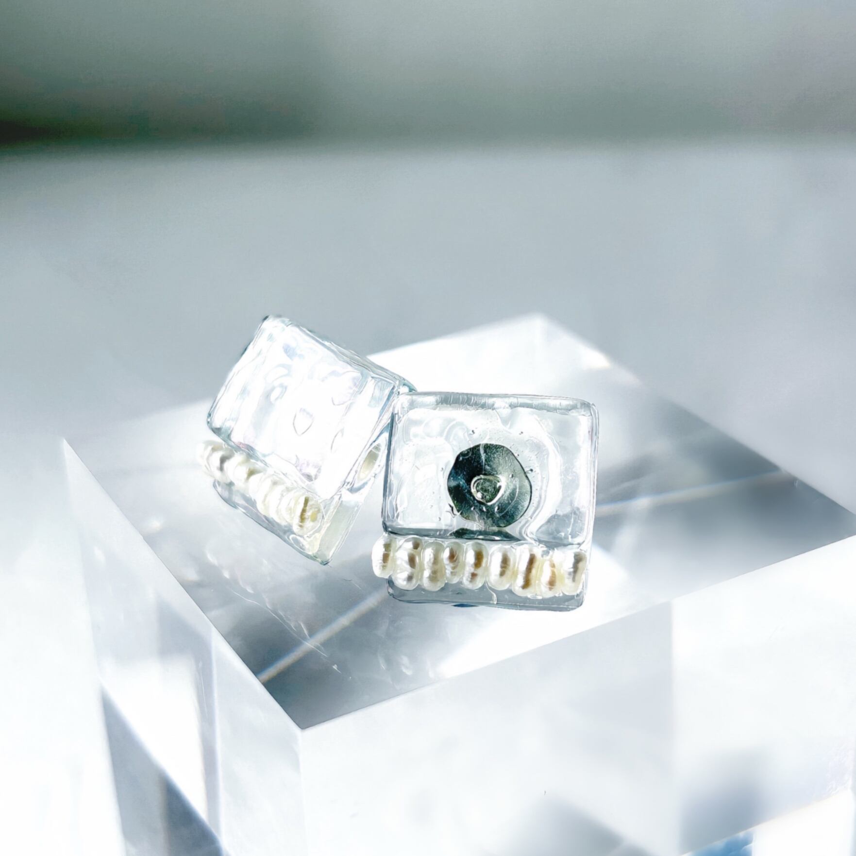 氷ガラスの淡水パール耳飾り-クリアオーロラ L-