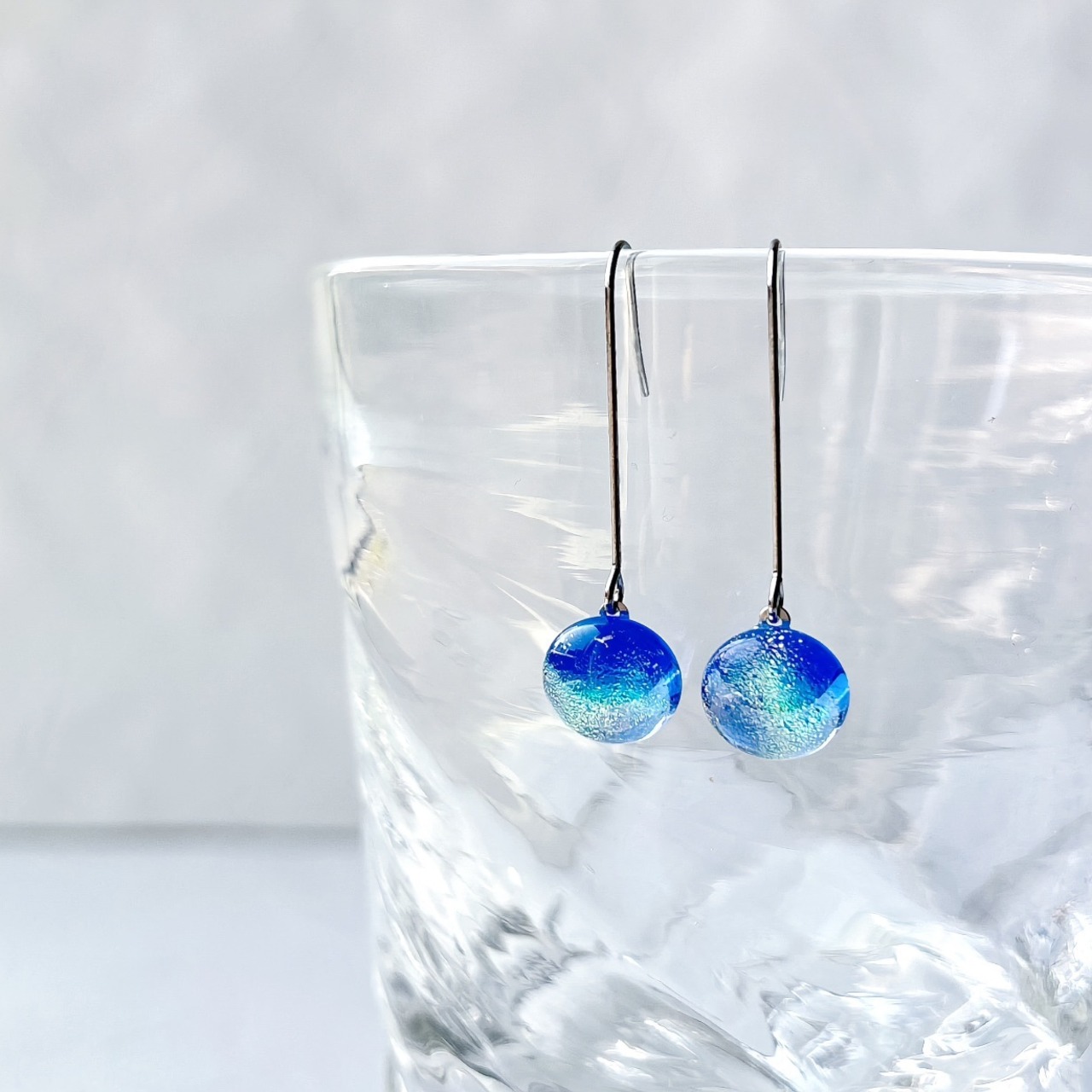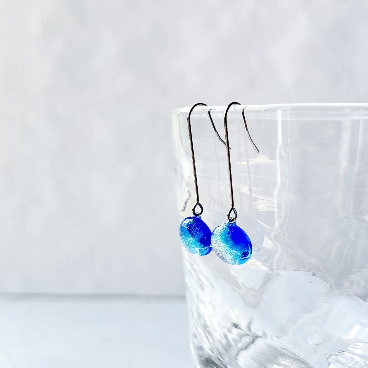 虹色ガラスのロングフックピアス-ブルーサファイア-
