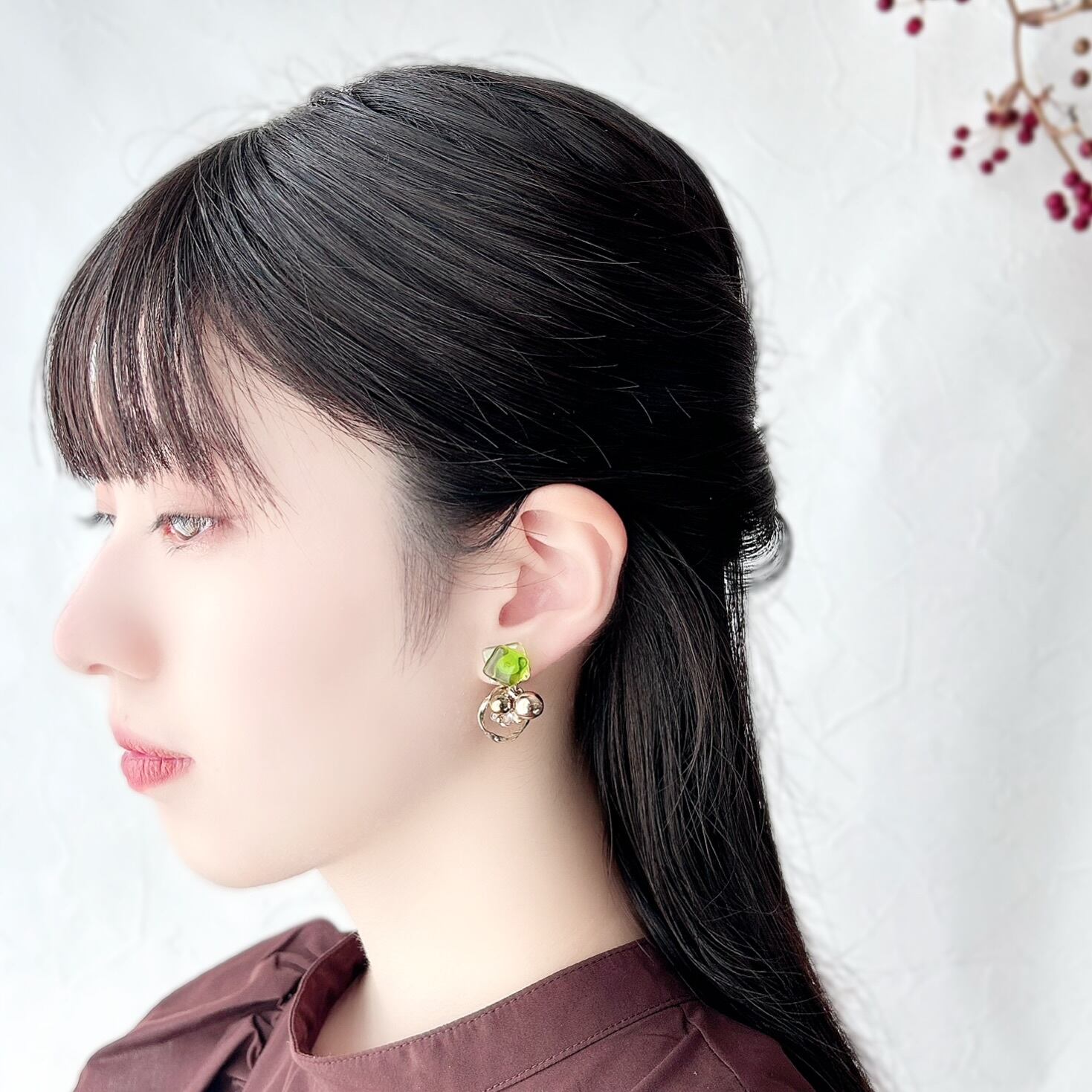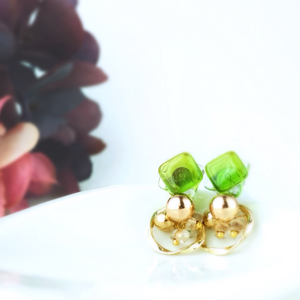 2way ダブルスクエアガラスのフープピアス-olive green-